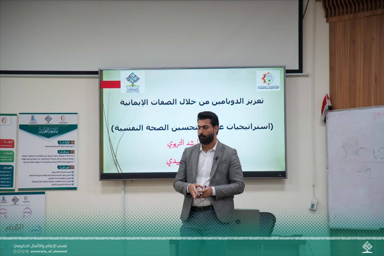 نظّم قسم الإرشاد النفسي والتوجيه التربوي في جامعة العميد محاضرةً إرشادية بعنوان (تعزيز الدوبامين من خلال الصفات الإيمانية)، قدّمها المرشد التربوي الأستاذ حسين محمد العميدي لطلبة المرحلة الثانية في كلية الصيدلة.