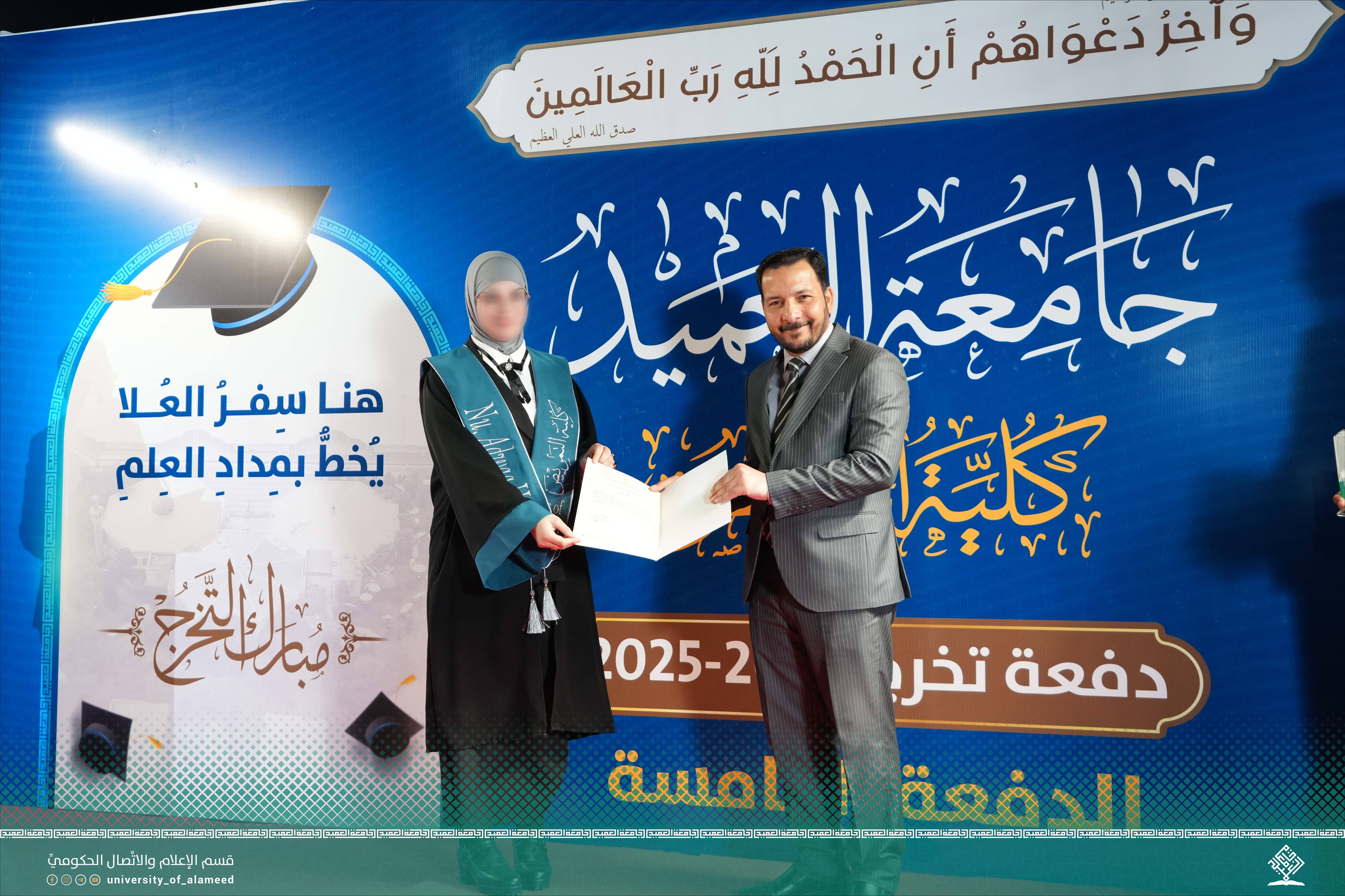 واستُهلَ الحفل بالتقاط الصور التذكارية للطلبة على المنصة، وسط تصفيق وتهاني الحاضرين من ذويهم وأساتذتهم، ثم توجَّهَ الخريجون إلى قاعة الإمام المجتبى (عليه السلام) لأداء قَسَم التخرج، في مشهدٍ مؤثر يُجسّد مدى فخرهم وانتمائهم لمهنتهم الإنسانية.